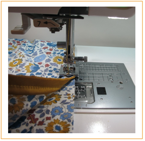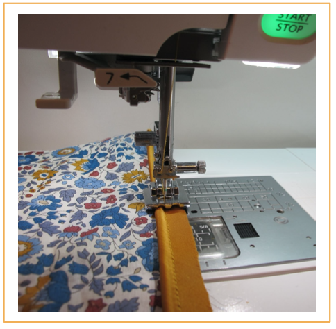 ★ Poser le ruban passepoil que vous avez précédemment réalisé sur le tissu, endroit sur endroit, bords coupé vers la droite. Assurez vous que le bord du ruban passepoil soit aligné avec le bord du tissu. Abaissez le pied pour que le cordonnet du ruban passepoil s’emboîte dans le sillon de gauche sous le pied. Cousez le tissu tout en guidant le passepoil dans le sillon de gauche.