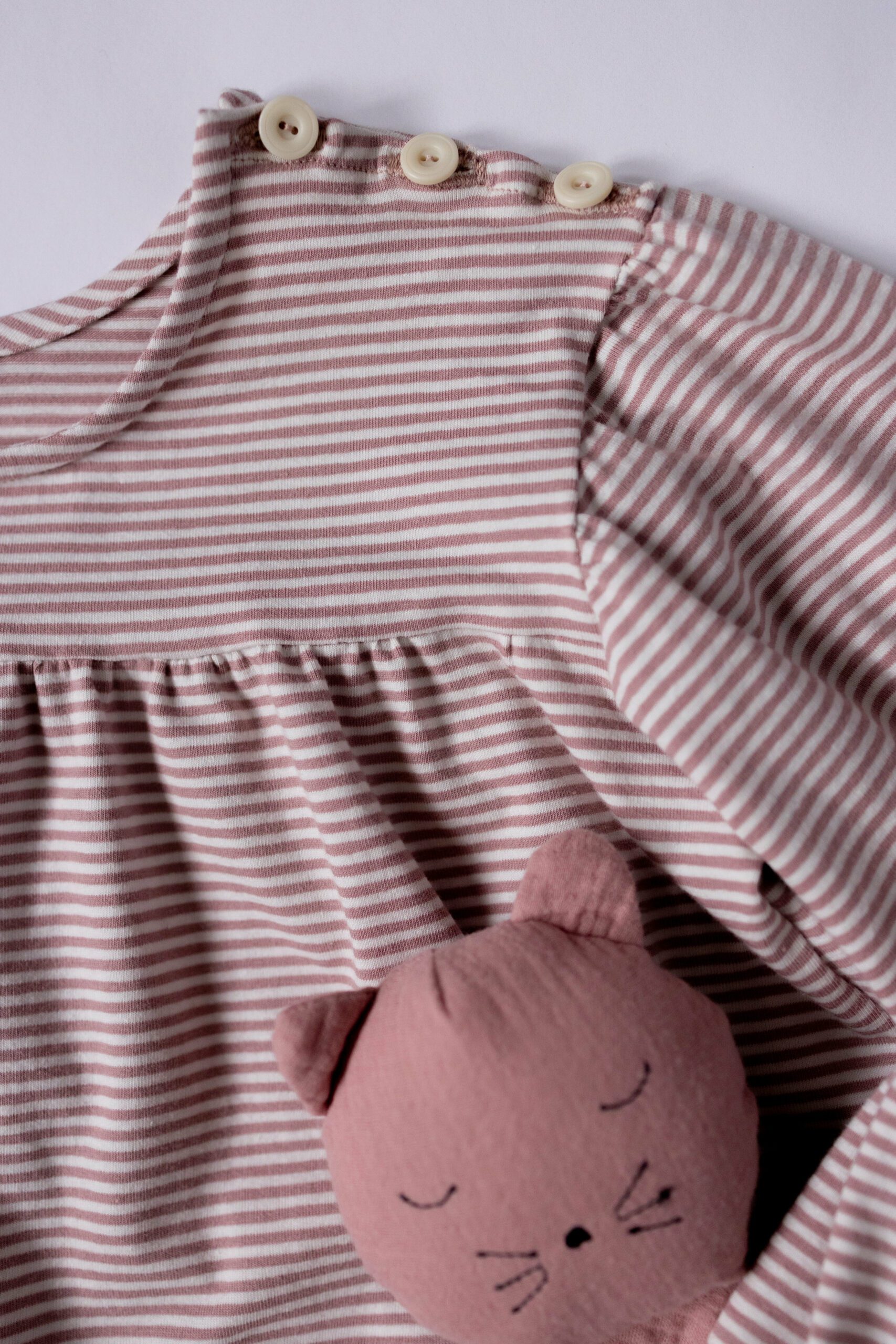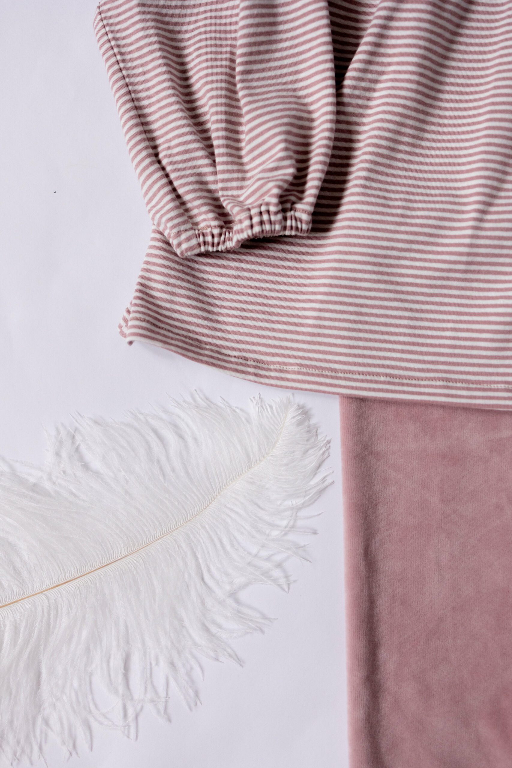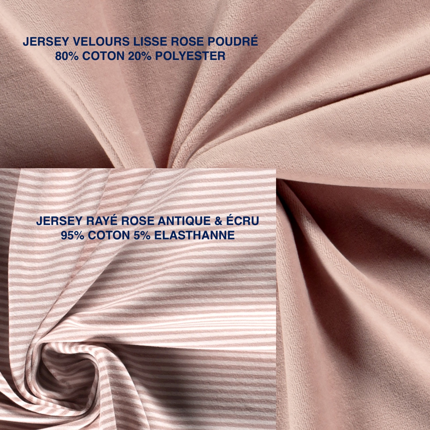 - Haut : Jersey rayé rose antique et écru (95% coton, 5% élasthanne) doux et extensible, pour un look rétro et délicat.