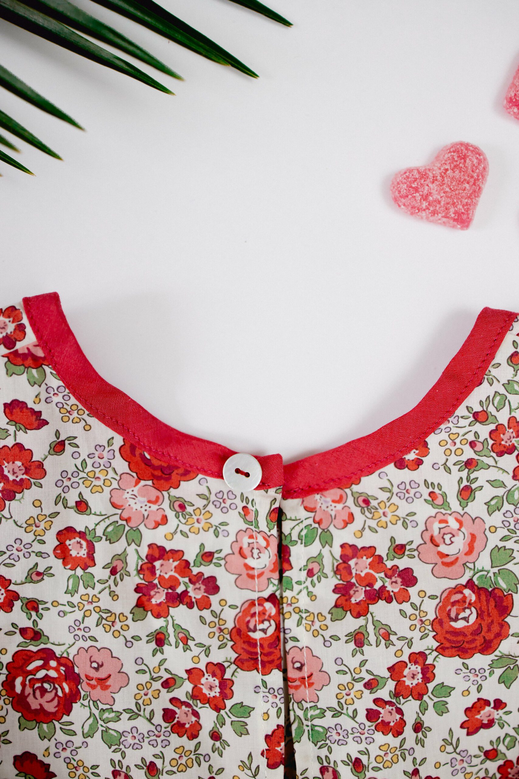 Encolure délicate : vous pouvez choisir entre un joli froncé ou des plis plats, le tout fini avec un biais rabattu sur l’endroit. Astuce : utilisez un tissu contrastant pour un petit détail qui fait toute la différence !
