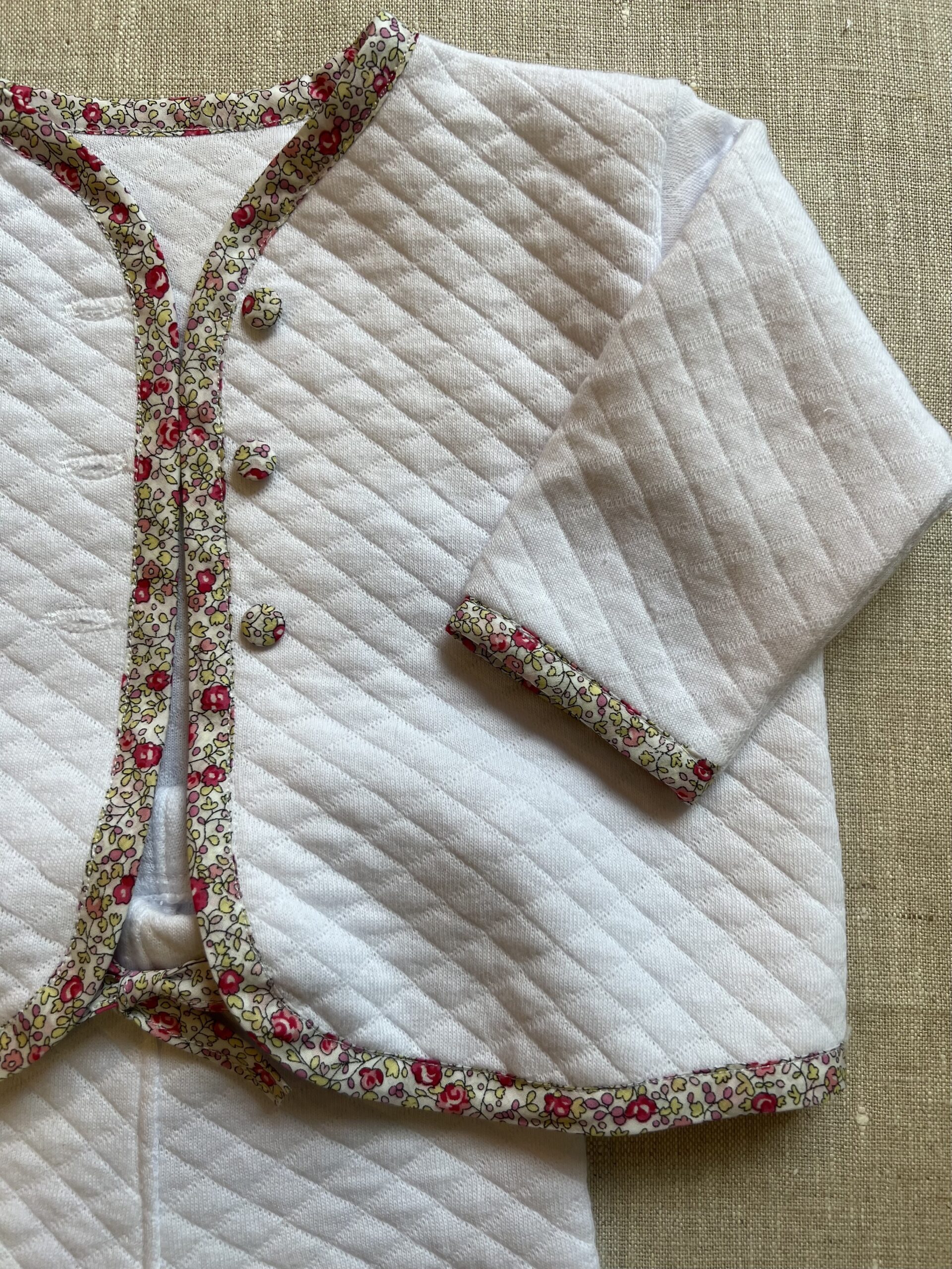 Style : Cardigan bordé d’un biais, avec fermeture par pressions.