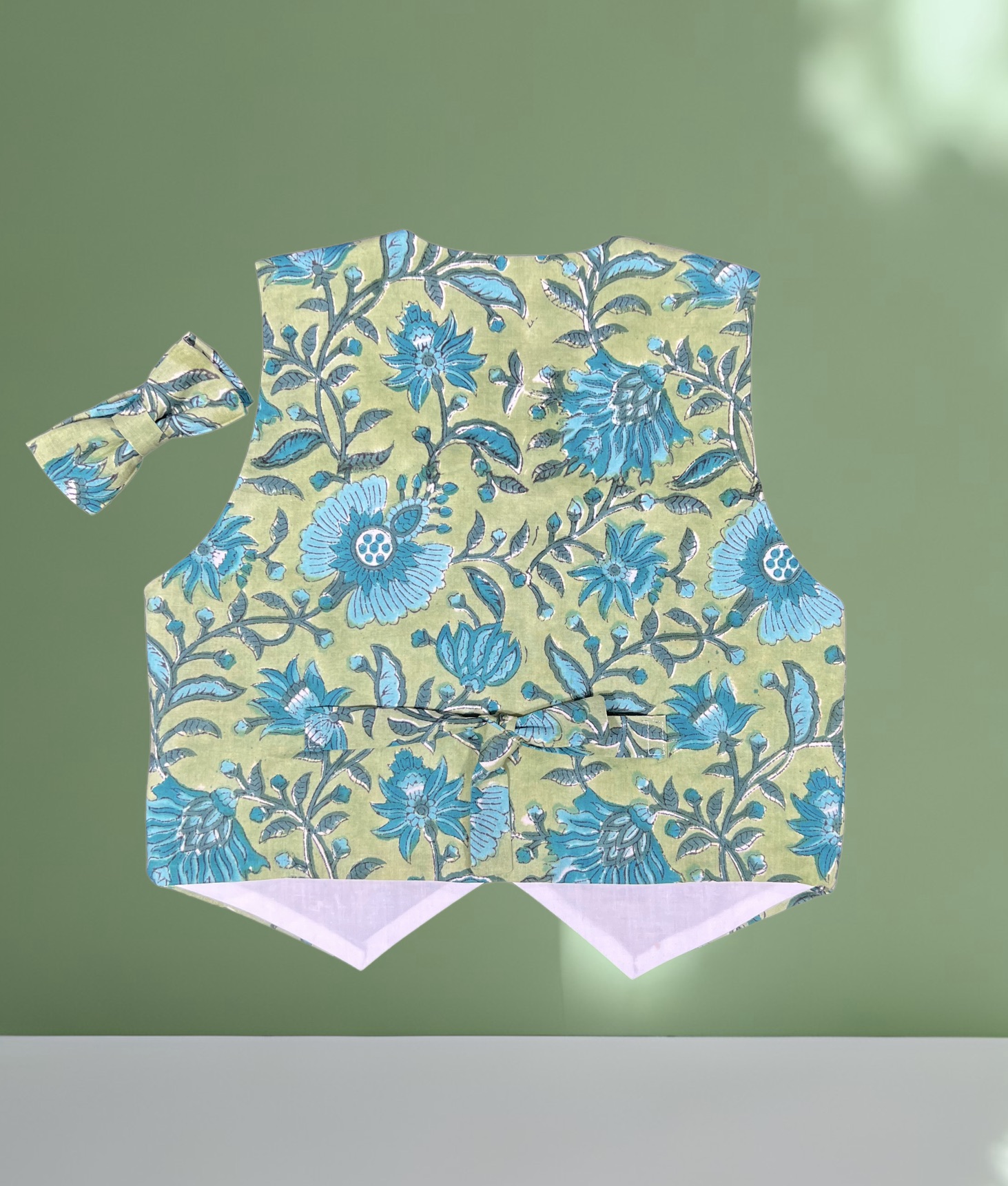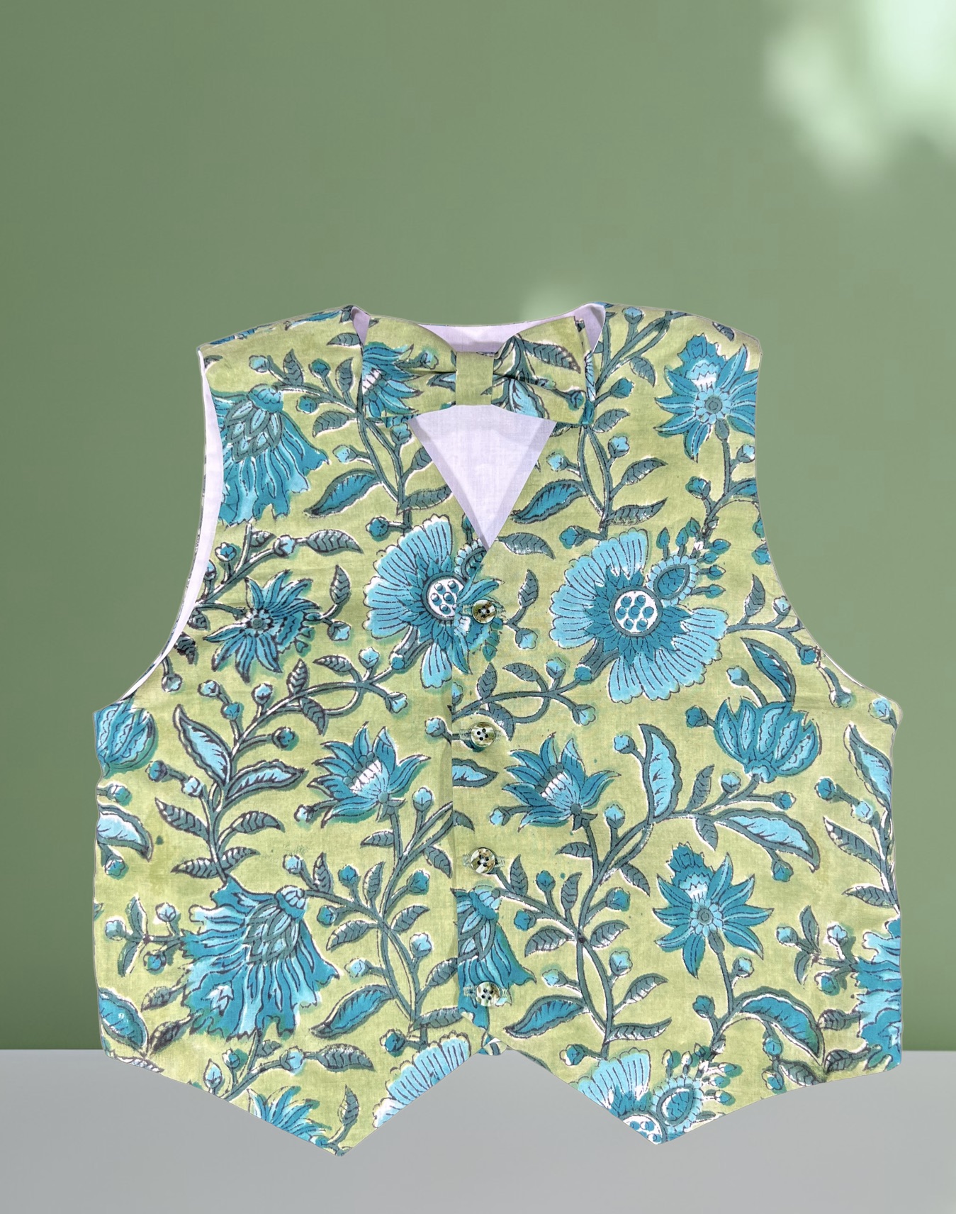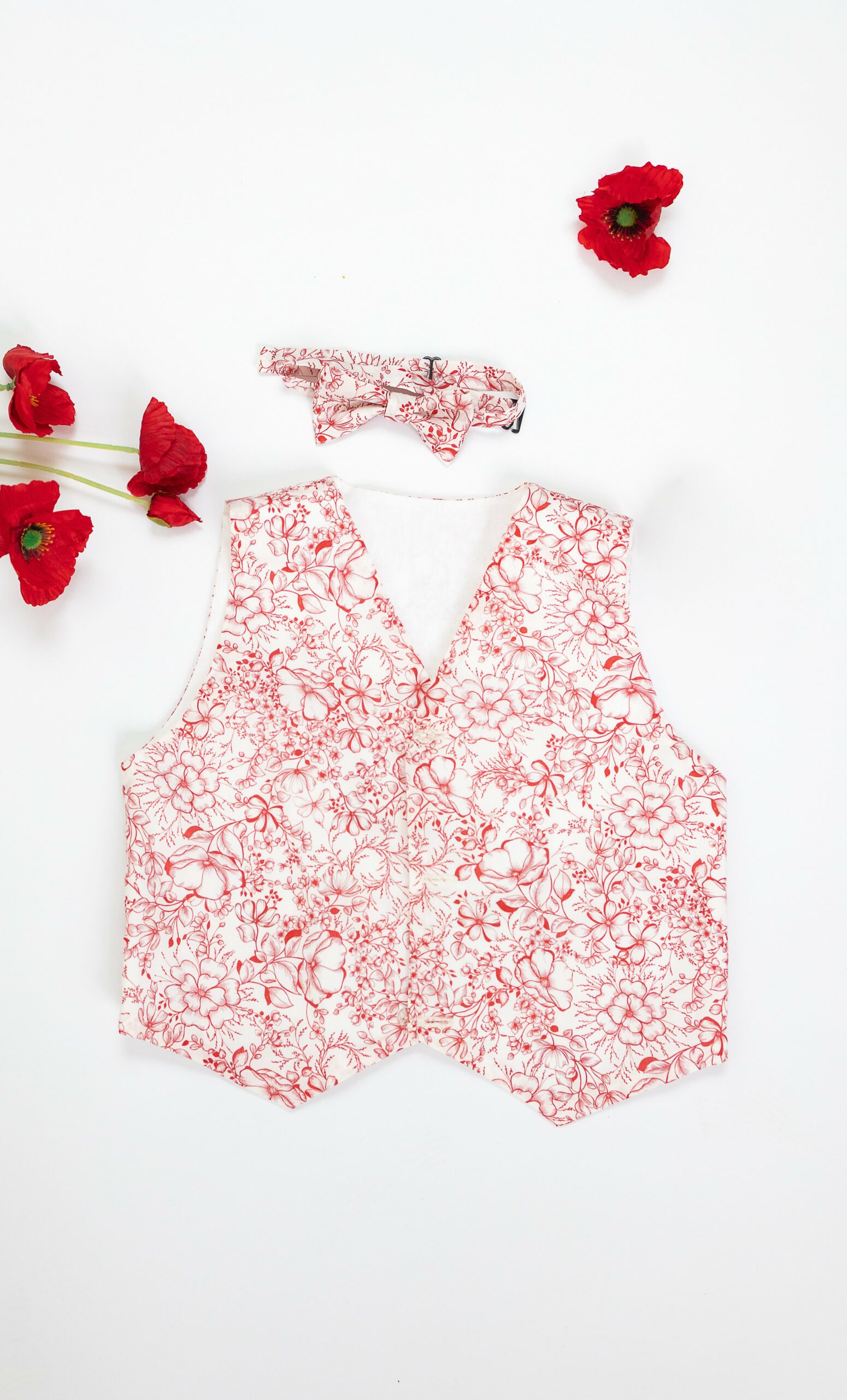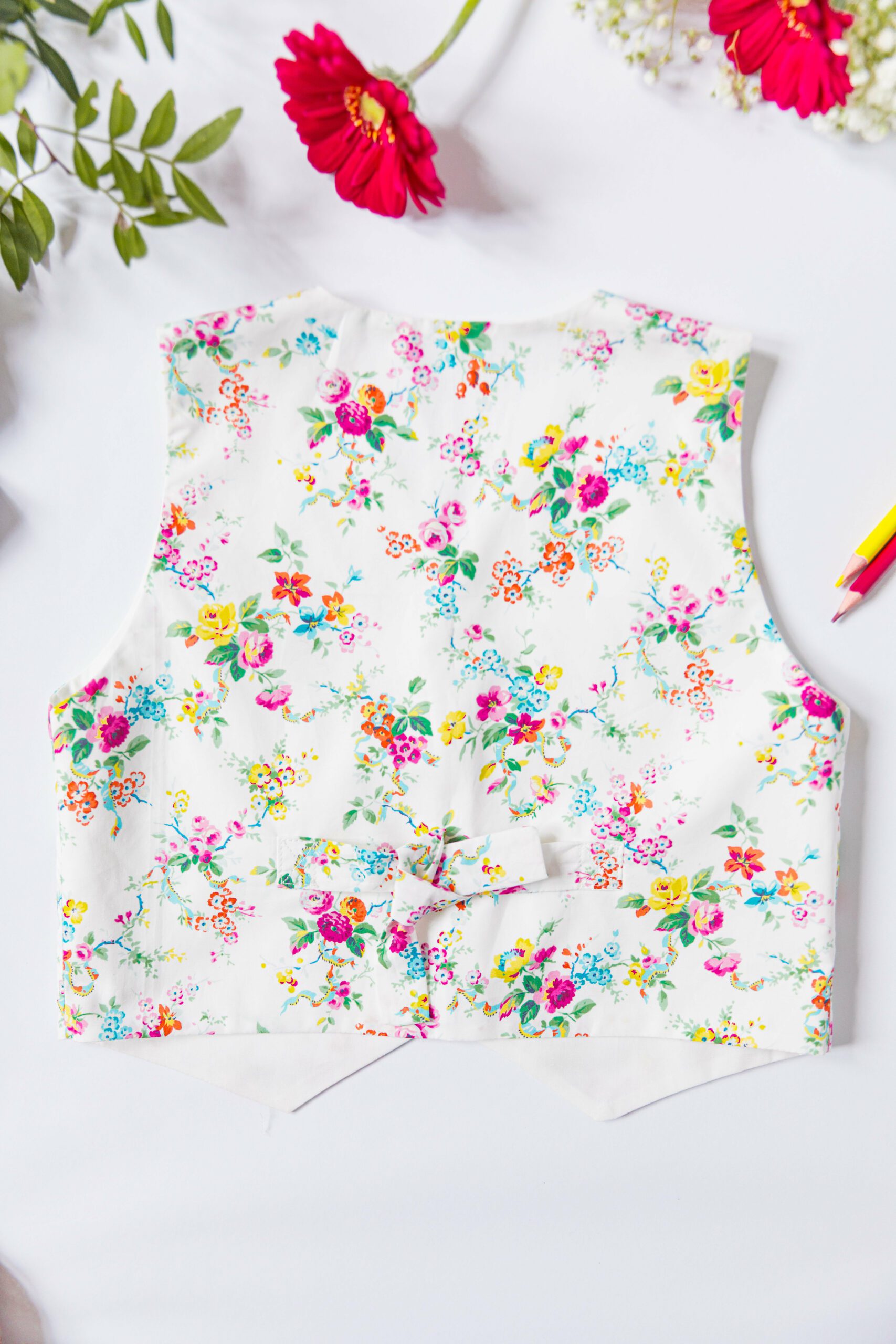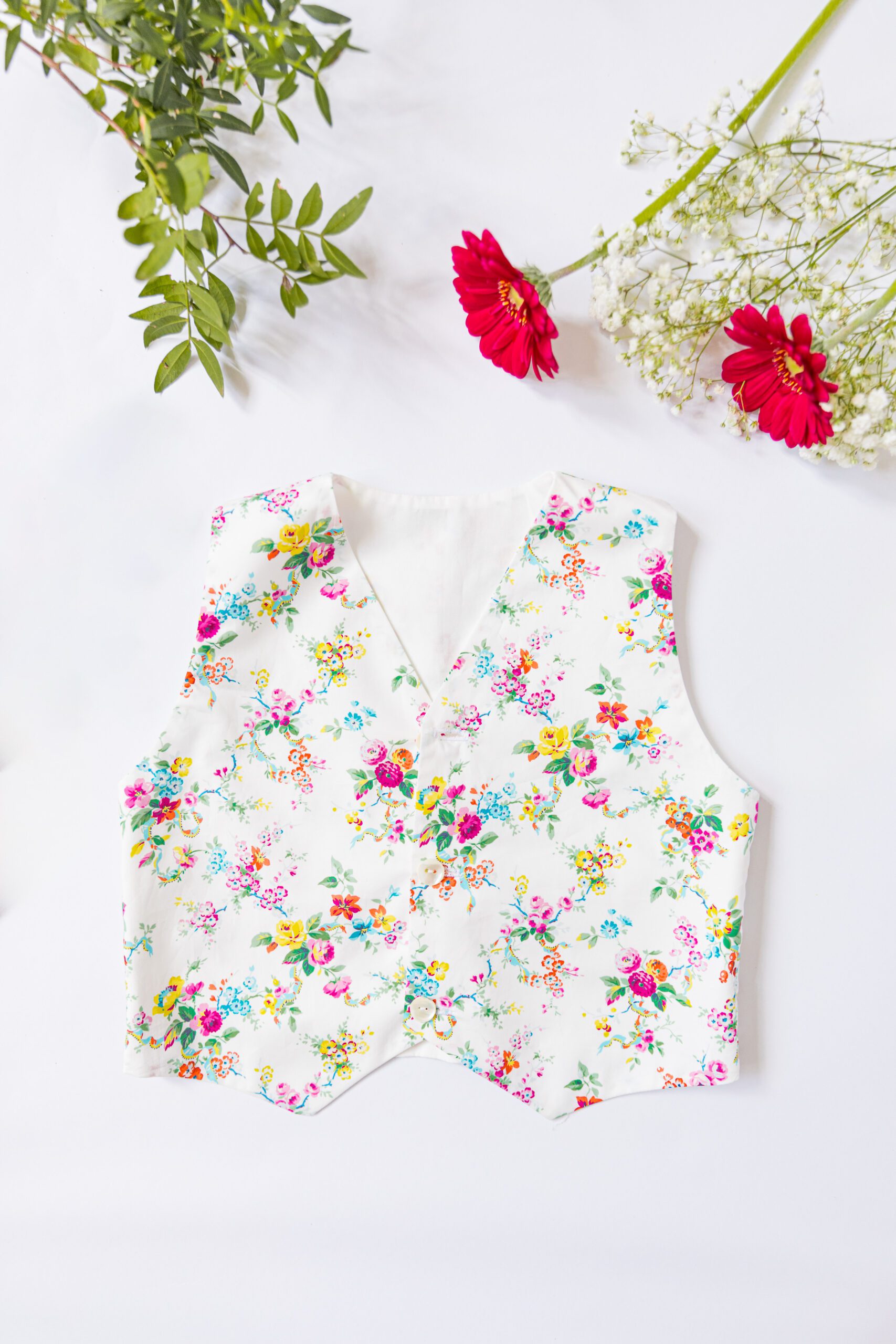 - Le gilet, boutonné sur le devant et doté d’une bride de serrage au dos, offre une jolie coupe ajustée. Entièrement doublé, il peut également être réversible pour multiplier les possibilités selon les tissus choisis.