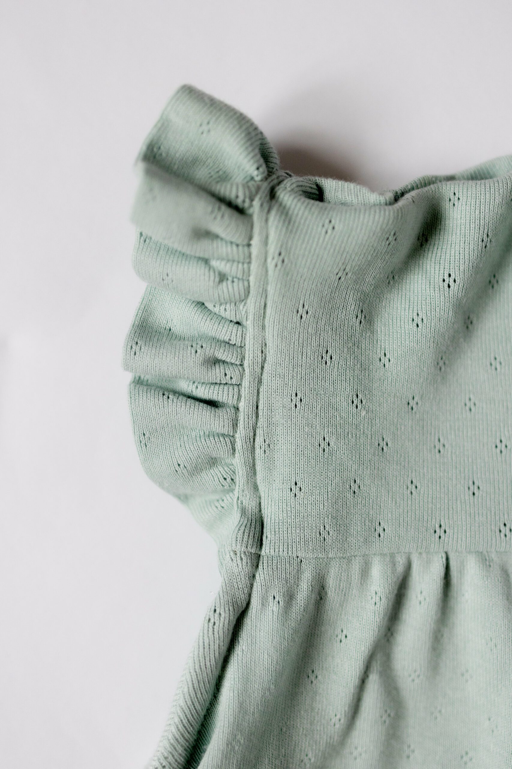 Elle peut être réalisée également sans manches, ornée d’un volant délicat sur les épaules pour une touche féminine et ludique.
